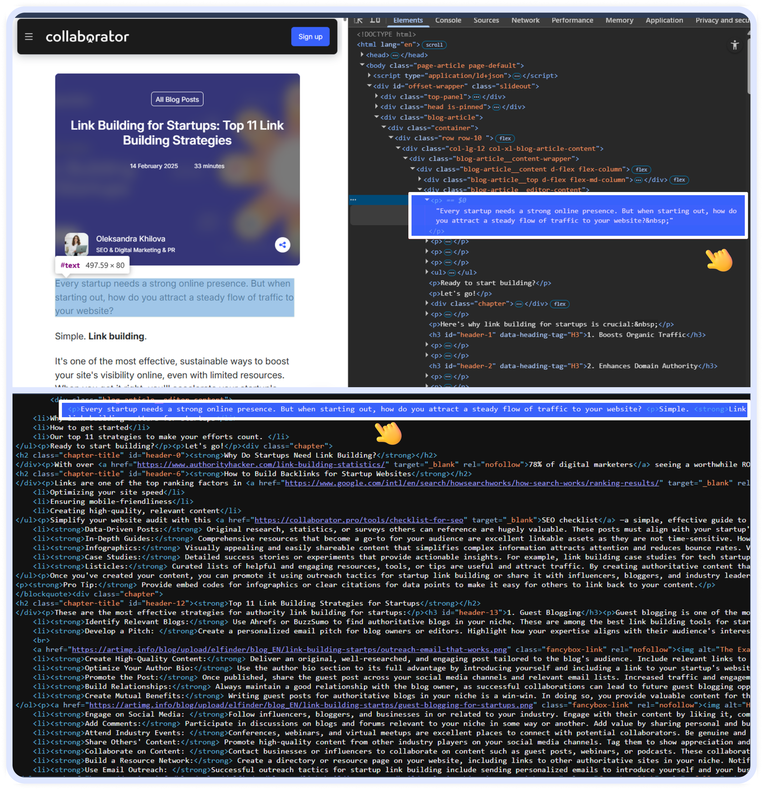 Example: check any page on the Collaborator blog, like a lovely article by Oleksandra Khilova https://collaborator.pro/blog/link-building-startups, inspect the elements using inspection tools, and then try to find the same HTML tags as in the page source: https://collaborator.pro/blog/link-building-startups